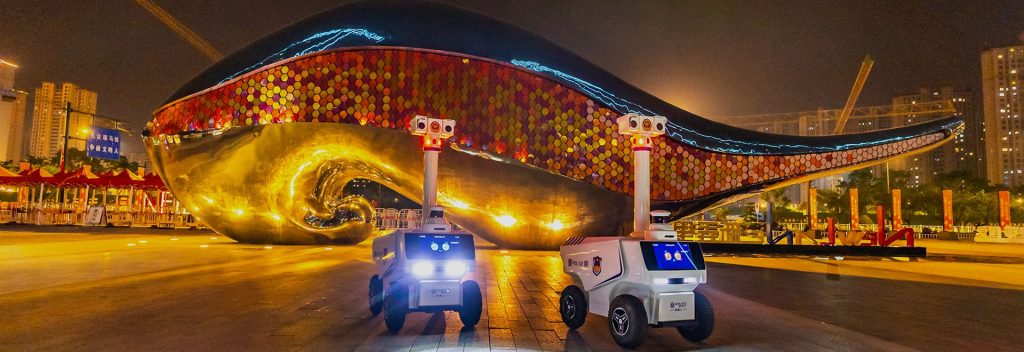 重大活动安保场景,警用巡逻机器人可大面积、全时域快速部控,执行巡逻监测、值守布控等任务,实现人脸识别、反诈宣传、安保提示、智能交互等业务功能,与现场固定监控及无人机形成空地一体的立体巡防。
